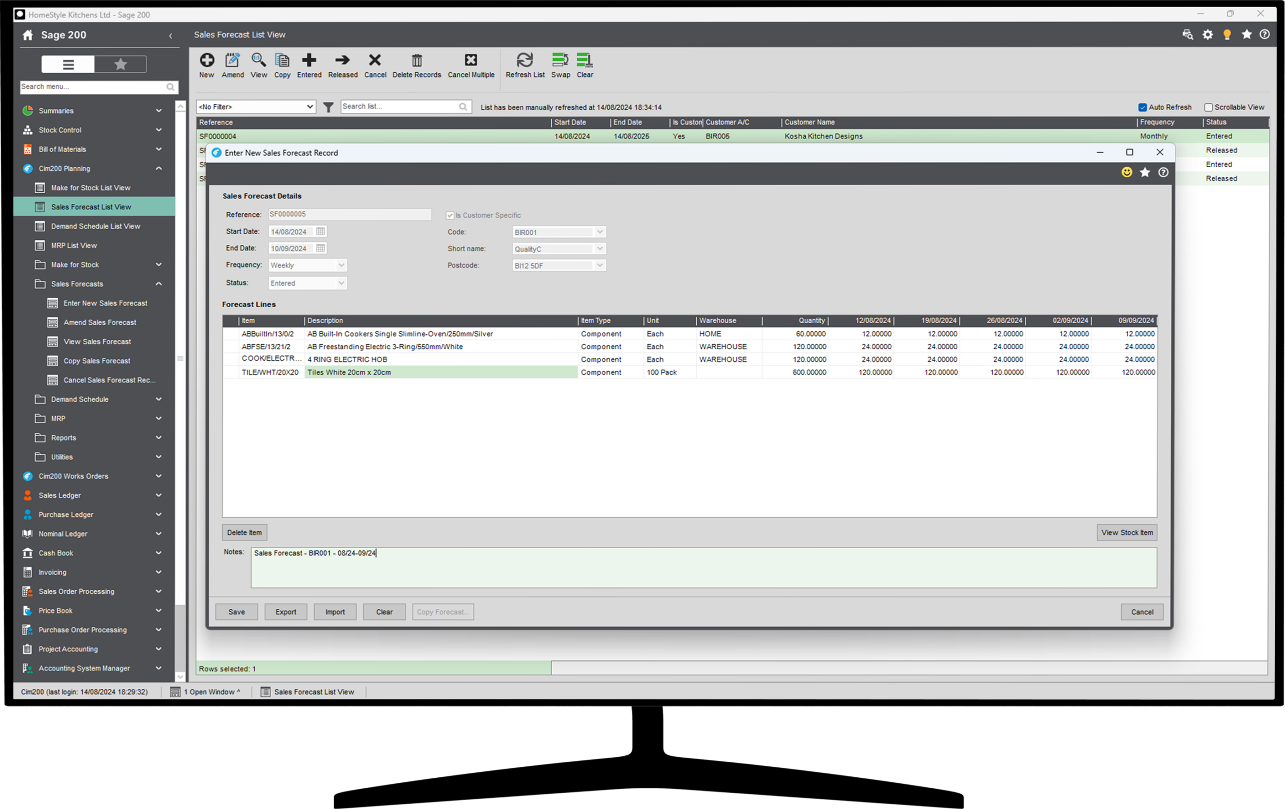Where customers regularly order products over a set period, but the lead time of the goods supplied is greater than the date span from order to the requirement date, utilise the Cim200 sales forecast functionality.