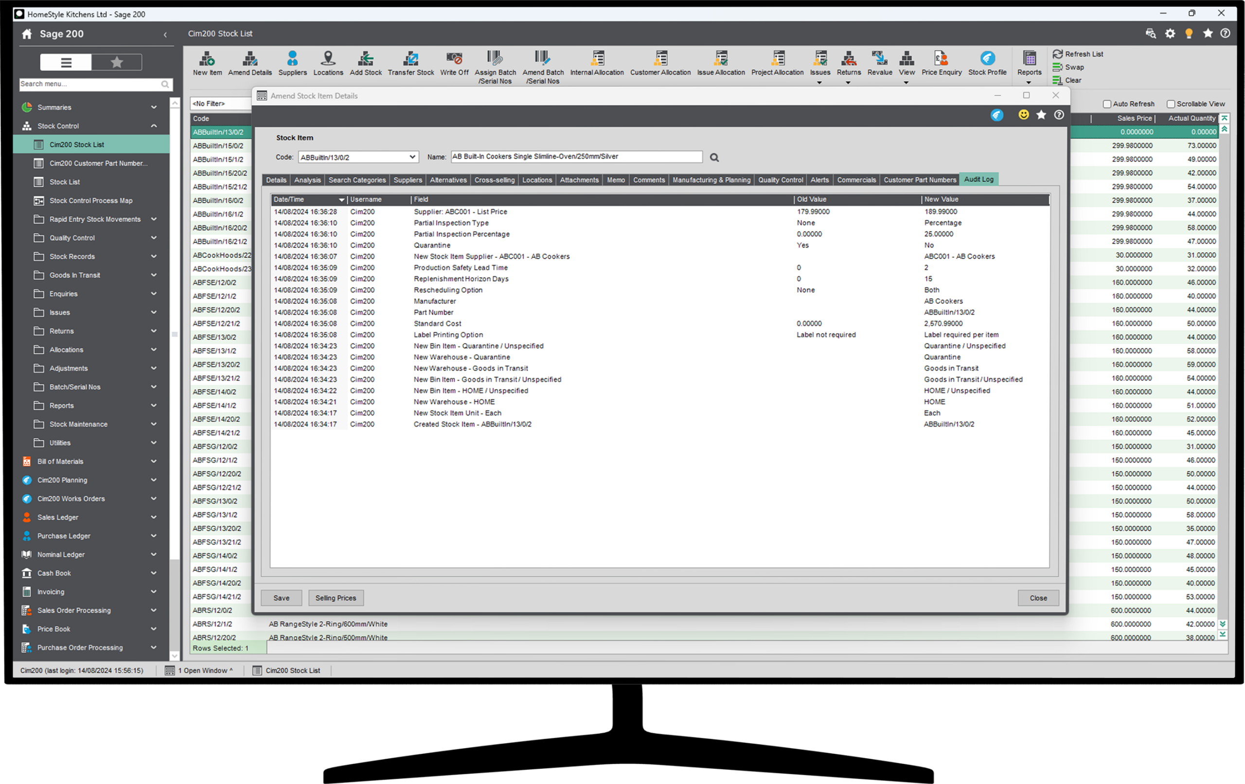 The Cim200 Audit Log records any change made to the static data associated with a stock record, whether it be a standard Sage 200 field or something specifically associated with Cim200, every change is captured by whom and date/time.
