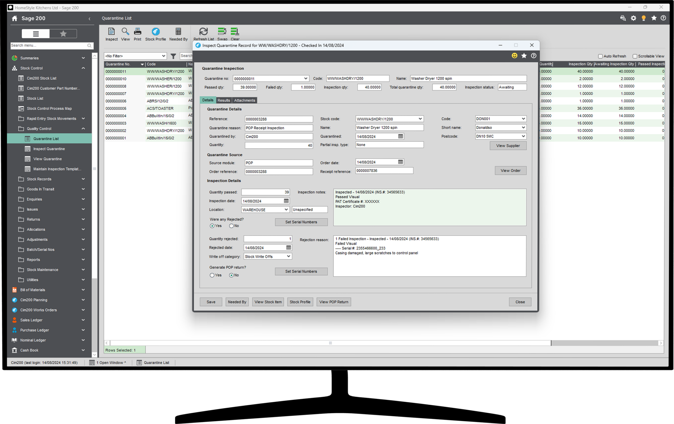 Yes, when you process the receipt in Sage 200 you can identify individual items for processing through quarantine, assigning each one an individual inspection template, ensure the correct checks are carried out at inspection. Any items that fail inspection can then generate a purchase return to send the goods back to the supplier.