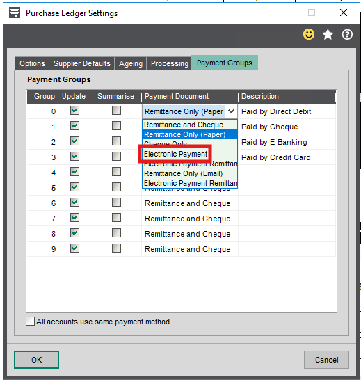 In the final stage of the process, you’ll configure the steps within Sage 200. Begin by setting up a payment group. This step generates the e-Banking document. To do this, navigate to Purchase Ledger > Utilities > Ledger Setup > Ledger Settings > Payment groups tab. From the Payment Document drop-down menu, select ‘Electronic Payment’.